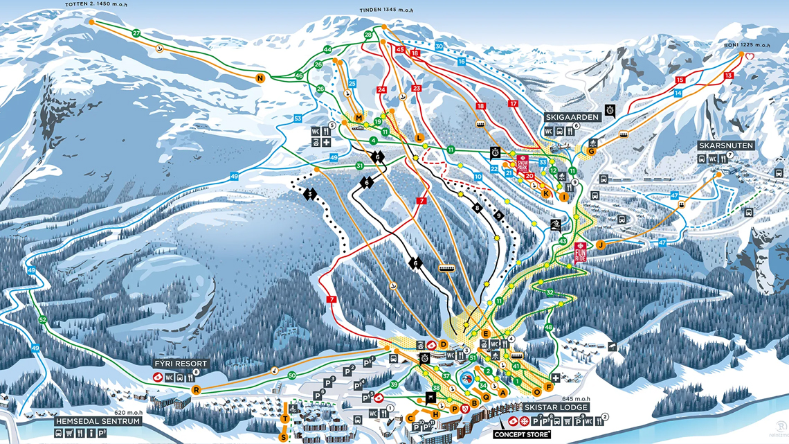 Hemsedal er et af Norges mest kendte og populære skiområder og omtales ofte som “de skandinaviske alper” på grund af det højalpine terræn og de markante fjeldtoppe. Pistekortet over Hemsedal viser et stort, sammenhængende skiområde med varierede nedfarter, der henvender sig til både begyndere, familier, øvede og eksperter. Terrænet er organiseret omkring tre hovedtoppe, hvilket giver lange, naturligt flydende pister og gode muligheder for at finde nye ruter dagen igennem.