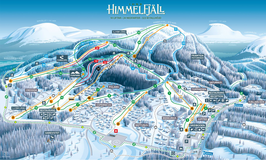Et pistekort over Idre Himmelfjäll giver et klart indblik i et nyere og moderne skiområde, der er skabt med fokus på komfort, plads og overskuelighed. Skiområdet rummer cirka 25 kilometer pister, hvor hovedparten er grønne og blå, men suppleret af enkelte røde pister, der giver progression for letøvede skiløbere.