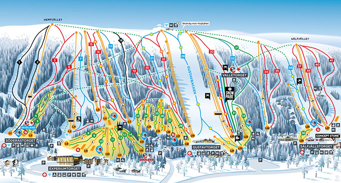 Liftsystemet i Lindvallen er et af de mest moderne i Sälen og består af stolelifte, slæbelifter og gondol, som effektivt forbinder alle dele af skiområdet. Pistekortet viser tydeligt transportlifte, der gør det nemt at bevæge sig mellem pister uden lange traverser. Store børneområder som Valleberget og Experium-området fylder en central del af pistekortet og understreger Lindvallens fokus på familier. Derudover vises funparks, skiskoleområder og forbindelser til øvrige Sälen-områder, hvilket gør pistekortet til et uundværligt planlægningsværktøj.