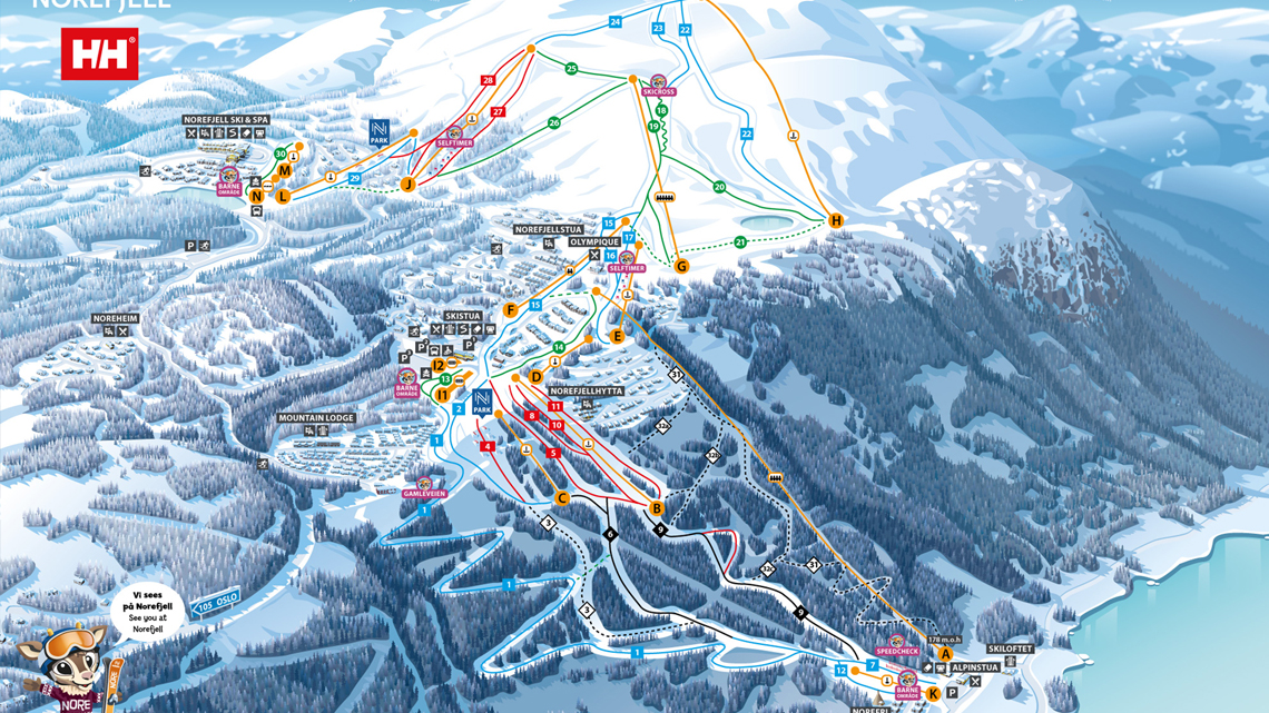 Norefjell er et af Norges mest tilgængelige fjeldområder og ligger kun få timers kørsel fra Oslo. Pistekortet over Norefjell viser et stort og varieret skiområde med imponerende faldhøjde og lange nedfarter, der gør destinationen attraktiv for både øvede og familier. Terrænet strækker sig fra høje fjeldtoppe helt ned til Norefjell Ski & Spa-området, hvilket giver en naturlig variation mellem åbne fjeldsider og mere skovbeklædte sektioner.