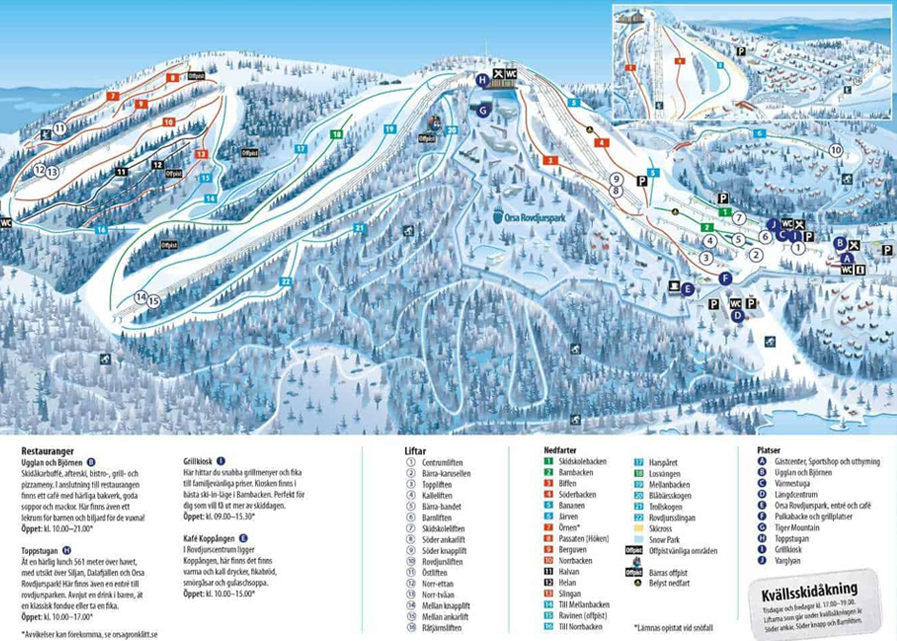 Liftsystemet består af slæbelifter, og pistekortet illustrerer tydeligt, hvordan alpint skiløb og langrend eksisterer side om side uden at forstyrre hinanden. Orsa Grönklitt pistekort er ideelt for gæster, der ønsker overblik og ro frem for kompleks struktur.