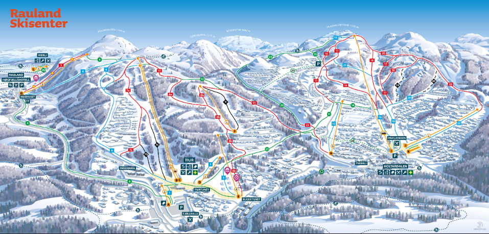Rauland er kendt for sine snesikre forhold og sit rolige, familievenlige skiterræn. Pistekortet over Rauland viser et stort område, der består af flere sammenhængende delområder, hvoraf de fleste har brede og lette pister, som egner sig særligt godt til begyndere og familier. Området har en indbydende atmosfære og god plads på pisterne, hvilket skaber trygge forhold for skiløbere på alle niveauer.
