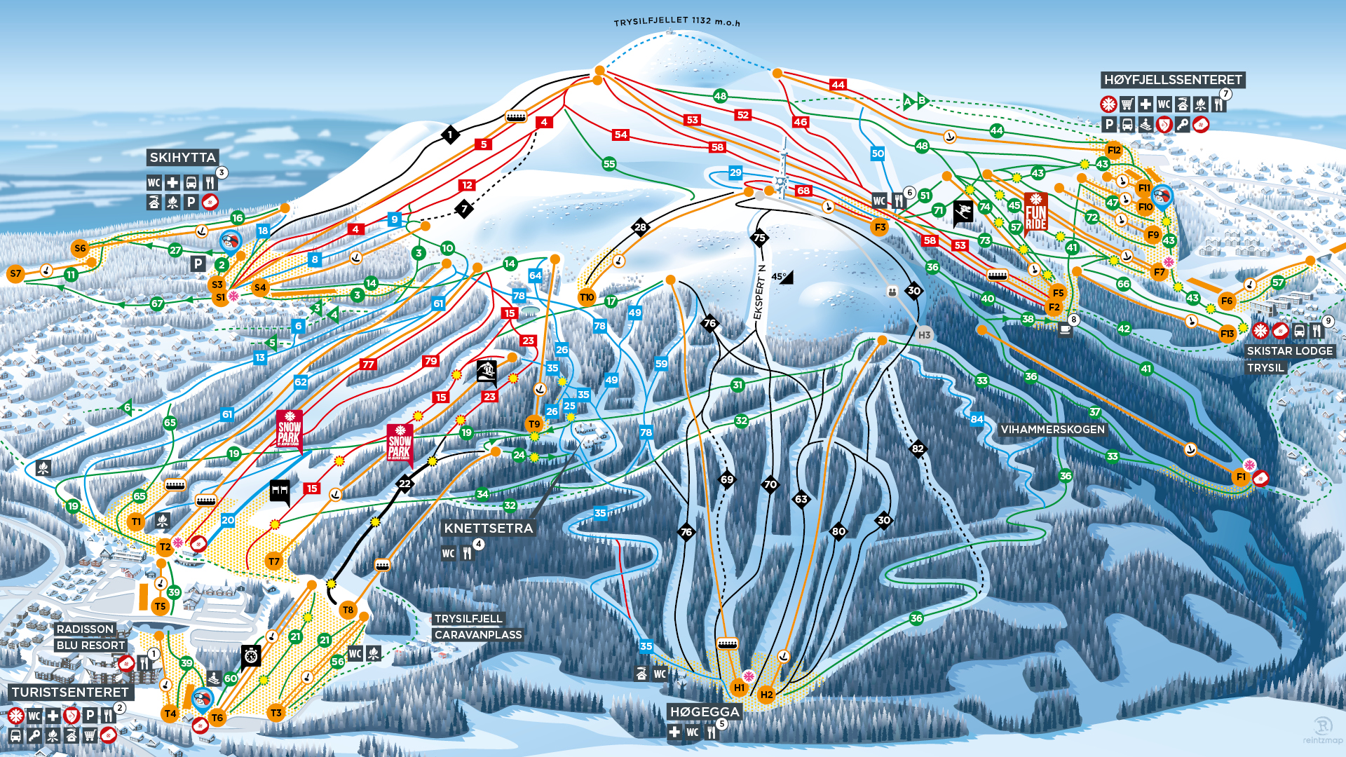 Klik på linket nedenfor for at læse mere om Trysil og se større pistekort og mulighed for at zoome. På siden kan du desuden se og booke alle hytter og lejligheder, samt se priser for liftkort, skileje og skiskole.